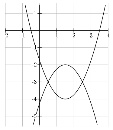 The curve crosses the x-axis at 2 and 4 and its vertex is at (3, 2).